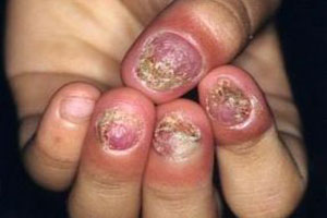2、引起并发症:灰指甲严重时可引起疼痛和不适,指甲一旦受到各种外伤,细菌易于长驱直入,从而引发甲沟炎、甲床炎、手指脓皮病等并发症,使病人发生丹毒或蜂窝组织炎等全身症状严重的疾病。