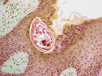 (3)虫行隧道:于手指缝处可见长约2---4毫米,呈灰褐色的不规则曲线,此为疥虫挖掘的隧道,是疥虫钻行的痕迹。