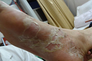 2、水疱型:好发于足缘部。初起为壁厚饱满的小水疱,有的可融合成大疱,疱液透明,周围无红晕。自觉奇痒,搔抓后常因继发感染而引起丹毒、淋巴管炎等。