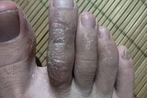 1、糜烂型:好发于第三与第四,第四与第五趾间。初起趾间潮湿,浸渍发白或起小水疱,干涸脱屑后,剥去皮屑为湿润、潮红的糜烂面,有奇痒,易继发感染。