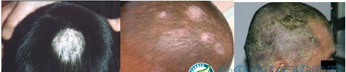 2、黄癣:每个年龄段都有可能会出现,但是儿童感染的几率比较高,典型皮损为盘状黄豆大小的黄癣痂,中心贯穿有毛发,病发参差不齐,干枯无光泽,愈后形成萎缩性疤痕,永久性秃发。