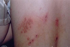 1、为成群的小水泡:皮疹为成群的小水疱,水疱为绿豆至米粒大小。皮肤基底发红,沿着周围神经单侧分布,排列层带状。个别严重者可泛发全身,称泛发性带状疱疹。