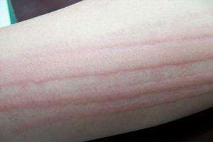 3、压力性荨麻疹:表现为皮肤受压后出现真皮及皮下组织弥漫性水肿及斑块、境界不清、常累及行走、站立后的足底、久坐后的臀部、提重物或穿紧身衣等受压处,有自觉瘙痒感、紧绷感、灼痛感或灼热感,