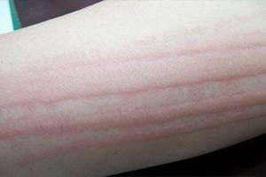 1、皮肤划痕荨麻疹:又称人工性荨麻疹。表现为用手搔或用钝器划过皮肤后,沿划痕出现条状隆起,伴瘙痒,不久后可自行消退。皮肤划痕症可持续数周、数月至数年。