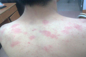 4、荨麻疹:急慢性荨麻疹是一种常见的皮肤血管反应性过敏性皮肤病,在中医属于“瘾疹”等范畴。起病先有皮肤瘙痒,后有风团,呈鲜红色或苍白色,略高出于皮肤,呈散发性,可融合成环状、地图状;几团可持续数分钟、数小时不等,消退后不留痕迹,时隐时现。进食鱼虾等可加重。